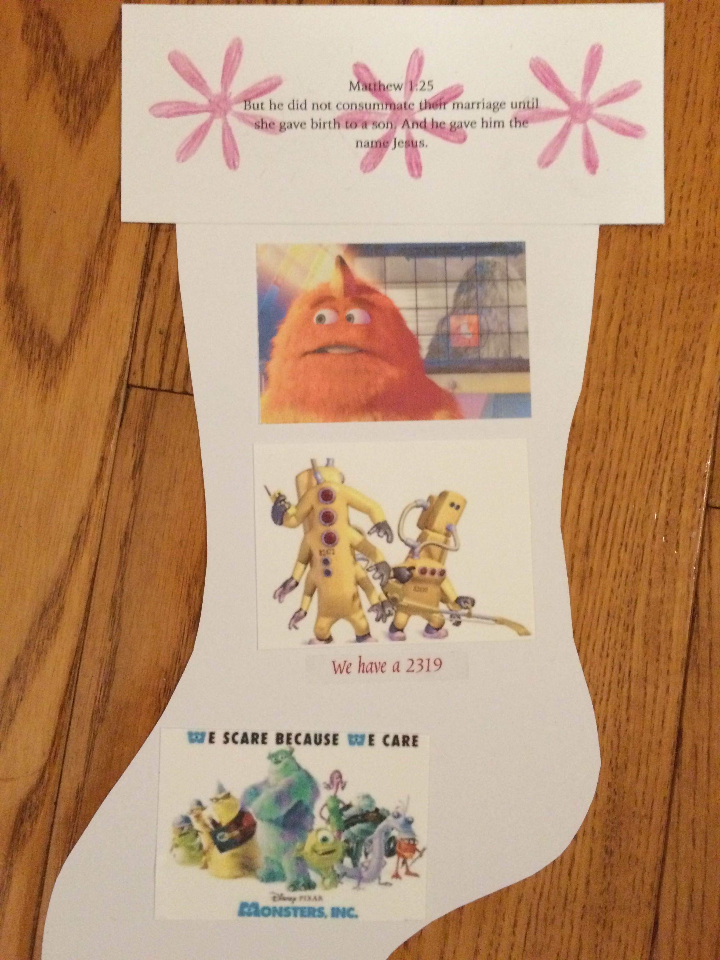 Women’s health has 2319 as a room so of course that required a special monsters inc stocking. It took a while for me to figure out how to upload the pictures and what size to make them so they would all fit. But I did it and it was my favorite stocking.