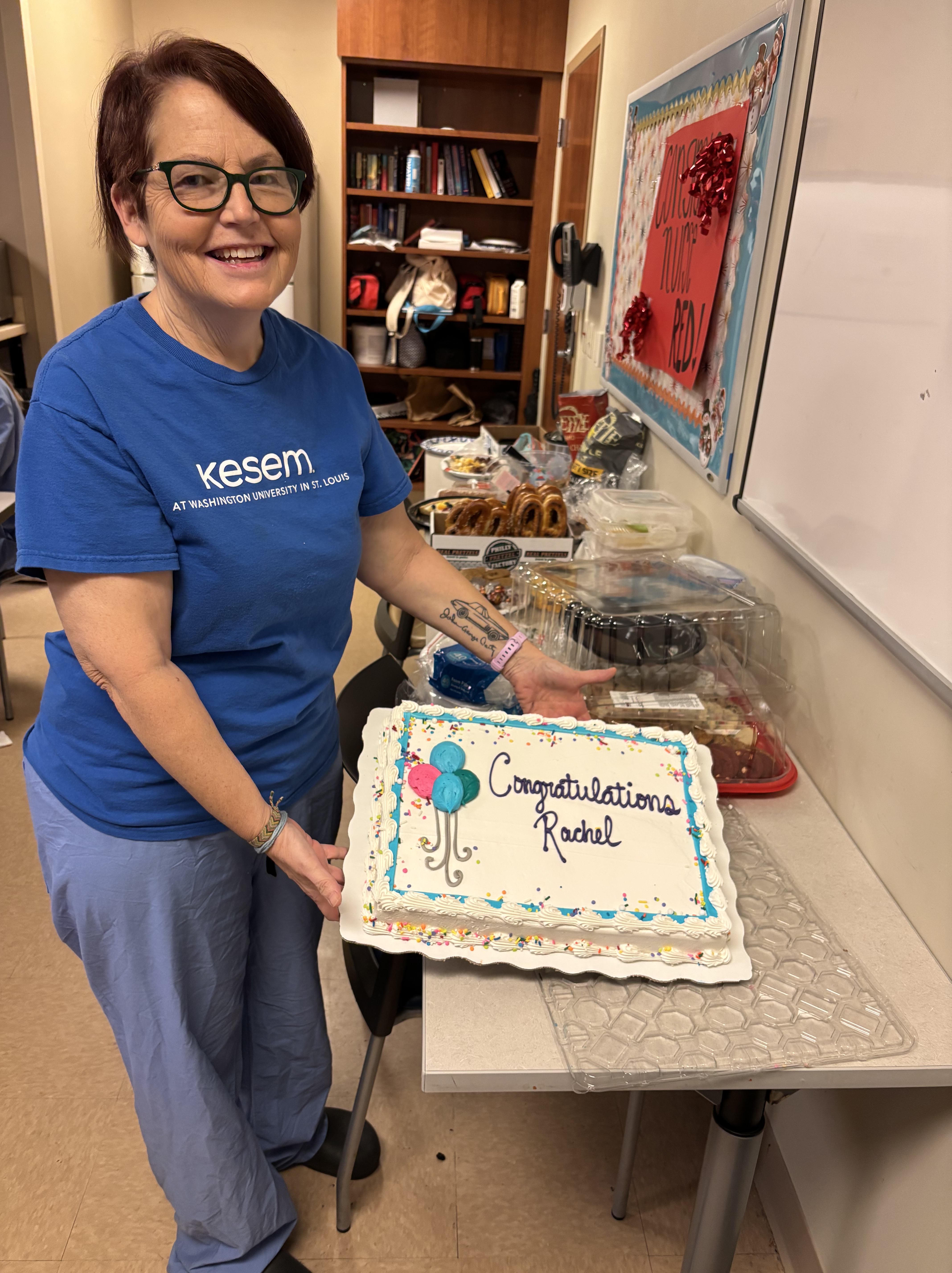 Ally made a poster on Friday and on Monday she said she was hanging it up in the break room so it wouldn’t get messed up. I was like no one knows who Nurse Red is and she said “that’s ok, we will tell them.” I woke up at 4am as I was very excited and around 11:30 Kelly who was working in the room with me asked if it was ok for if she stepped out for five minutes to take care of something. I said sure but asked her what she was up to. She replied nothing and I said you are acting suspicious. As I was walking past the break room I noticed it smelled wonderful and thought anesthesia must have bought us food. Both rooms finished with morning cases at the same time so I said great let’s go do the brick. When they told me no let’s go to the break room first I became very suspicious. The food was for me and I had a cake and everything. The sneaky snakes I work with got together with the girls that get our patients ready and send home and planned a pot luck. Kelly had ordered pretzels which is why she needed to step out.