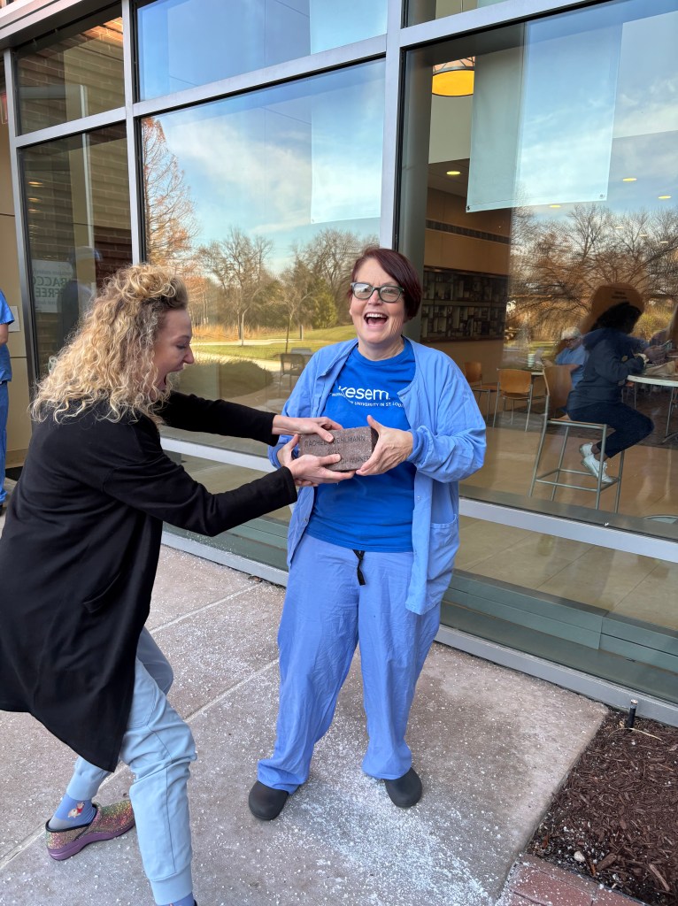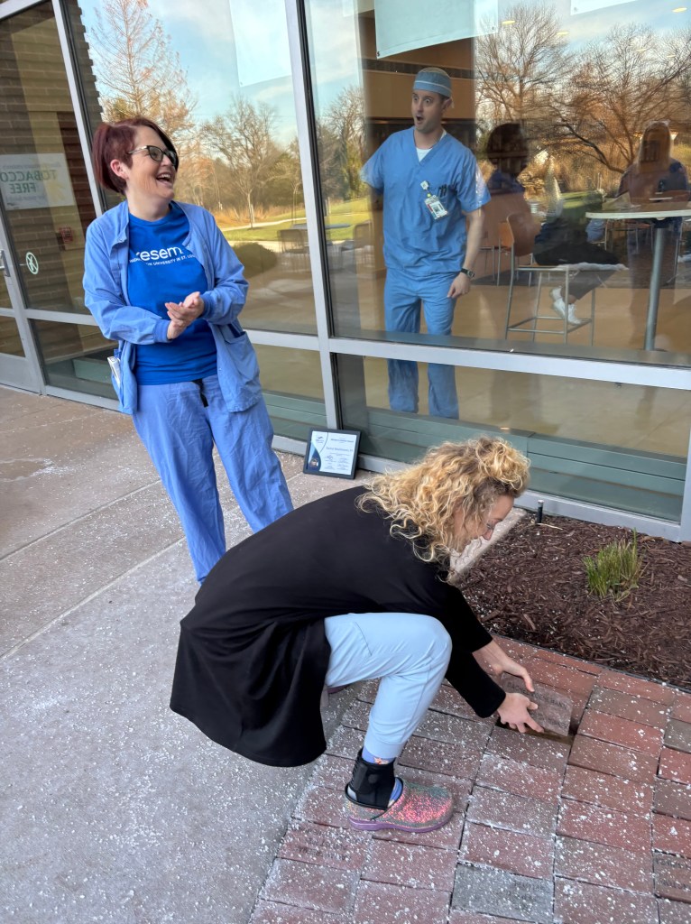 At the end of the shift Sarah was checking her email and received a weird email so I said let me see if I received one too. Imagine my horror when I discovered the previous Friday was the brick ceremony and I received a brick with my name on it and was not there for it. I walked downstairs and found the brick and took photos. I then came back upstairs and was an emotional wreck. I also learned there was a luncheon that I also missed out on. The next day at work I emailed the CNO and the president of the hospital to let them know how upset I was that I missed that and that no one had told me about this. I heard back from the CNO a couple days later and then the president of the hospital called me personally a week later. When I looked at my caller ID and it said his name, my first thought OMG I’m in trouble. Then I said calm down and answered the phone. He was extremely apologetic and told me my award was sitting on the CNO’s desk. He offered to mail it to me but I said I am working tomorrow I can stop by and pick it up. He said that was fine and I said I would have to work up the nerve because administration is scary.